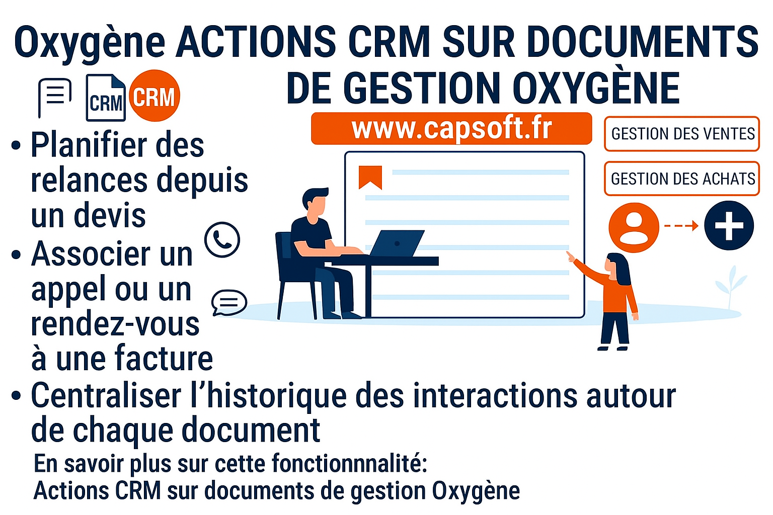 En intégrant les actions CRM directement aux documents de gestion Oxygène, vous disposez d’une visibilité améliorée sur l’ensemble de vos processus. Accessible par document ou de manière globale via le CRM, cette approche garantit une gestion plus fluide et efficace pour les opérations commerciales et administratives.