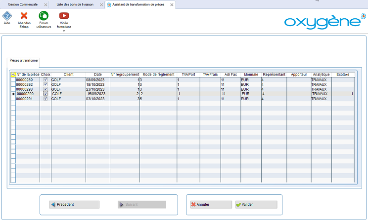 Composant métier additionnel Oxygène, le regroupement des BLC (Bons de livraisons client) sur factures de ventes clients consiste à identifier via un tableau de bord en amont la "faisabilité du regroupement" par un même indice de regroupement l'ensemble des documents susceptibles d'être transformés dans un même document cible.